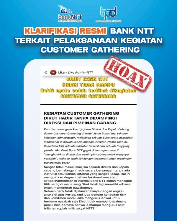 Menanggapi hal itu, manajemen Bank NTT dalam keterangan resmi tertanggal 18 Februari 2026 menegaskan bahwa informasi tersebut tidak benar dan bersifat spekulatif.